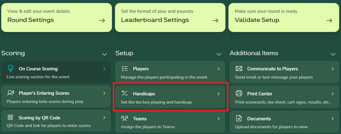 From the Advanced Event Home, select the “Handicaps” button to open the page where player handicaps and tee box assignments can be manually set or modified.