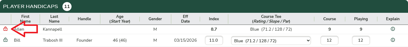 When a player’s handicap is locked, it prevents both manual and system updates to that handicap. To modify the value, click the lock icon to unlock the player’s handicap.