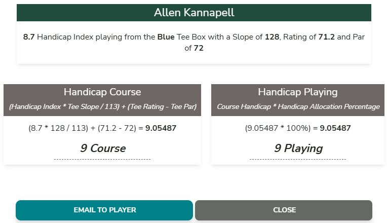 Clicking the “i” icon next to each player provides a detailed explanation of how the player’s handicap was calculated based on the World Handicap System rules and the event settings.