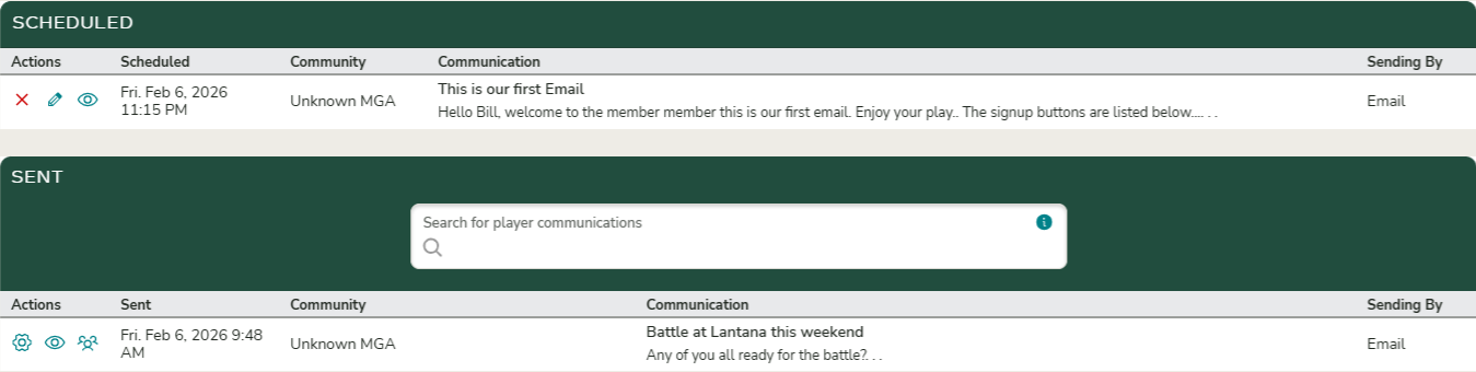 Communication Hub is the central location for sending email and text messages to your club or community players.