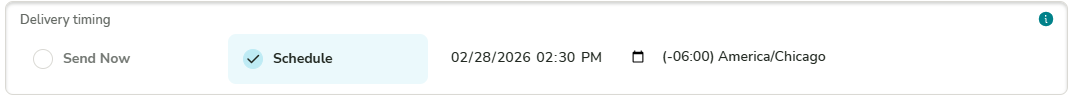 Communications can be sent immediately or scheduled for delivery at a future date and time. When scheduling a message, the Send button will not be shown; instead, saving the communication will schedule it to be sent at the designated time.