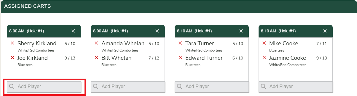 Each cart includes an “Add Player” search field at the bottom that allows you to find and assign a player to that cart.