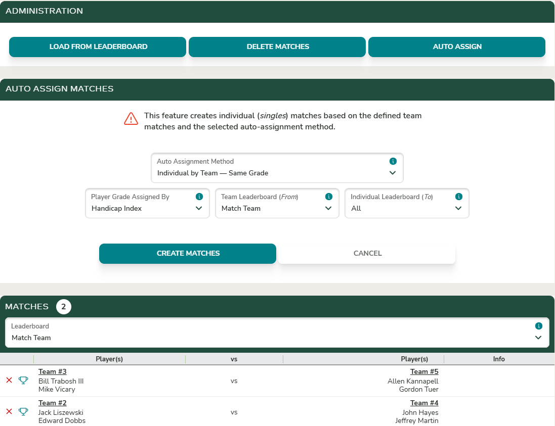 To create the singles matches, click the Auto Assign button on the Matches page.