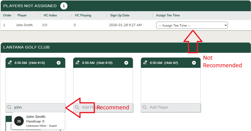 If you plan to manually assign players to tee times, we recommend using the search fields at the bottom of each tee time box. Using the drop-down next to a player’s name in the Not Assigned section works well for individual assignments, but it is less efficient for assigning multiple players.