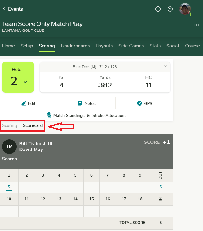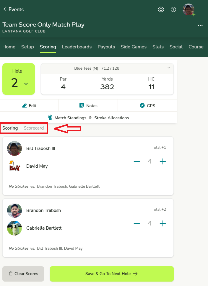 On the Scoring tab, the Scoring / Scorecard toggle is located just below the hole score information and just above the list of players.