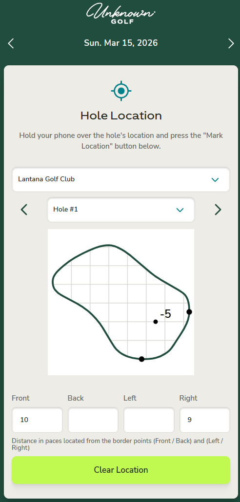 The Pin Location Assignment app provides a convenient way to enter the pin location for each hole. The arrows at the top of the screen allow you to switch between days, making it easy to set pin locations for multiple upcoming days.