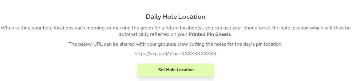 From your Club Home, navigate to Admin Settings → Courses. In this section you will find Daily Hole Location with a “Set Hole Location” button that opens the Pin Location Assignment App for setting the pin positions for the day.